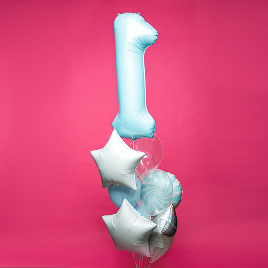 Bukiet balonowy z helem, 9 sztuk, niebieska jedynka, gwiazdki - Roczek chłopca