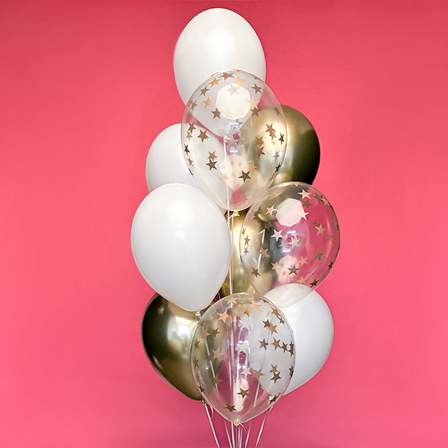 Bukiet balonów z helem, gwiazdki, 10 sztuk - White & Gold & Stars