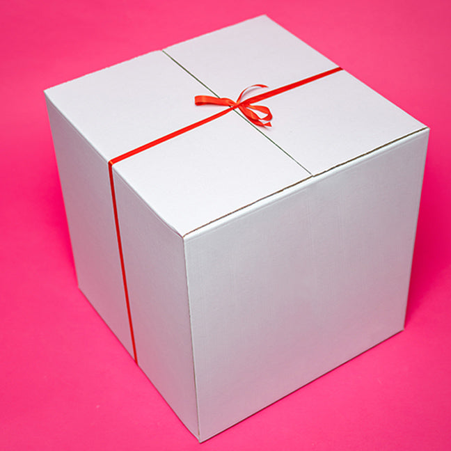 Biały karton klapowy wykonany z obustronnie białej tektury. To znaczy że karton jest biały w środku i na zewnątrz. Wspaniale sprawdza się jako opakowanie prezentowe. Ozdobiony od środka kolorową bibułą a z zewnątrz dekoracyjną wstążką. Karton wielkości : 65x65x65cm